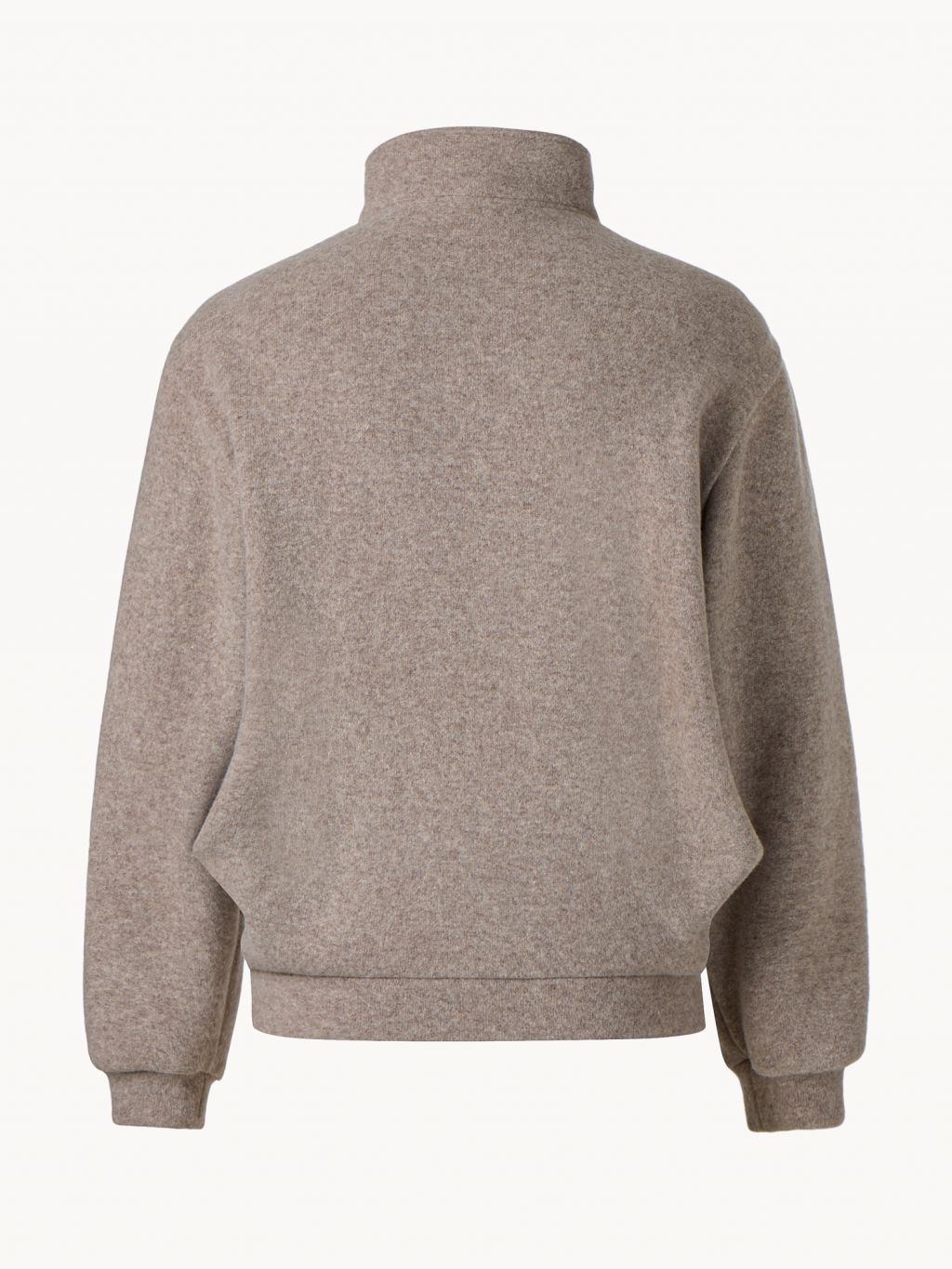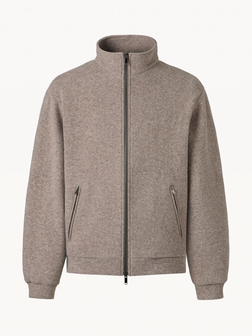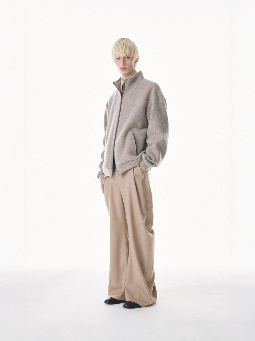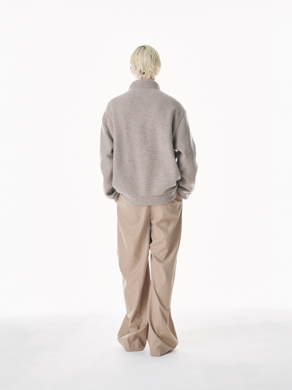 Crafted from Super 140s wool fleece with a cashmere-like softness and texture. Exceptionally smooth and warm to the touch, the fabric's gentle warmth reflects the quality of its raw materials. This comes from a unique knit structure where connecting yarns form precise equilateral triangles, unlike conventional knitting. The design remains minimal with elegant pattern cutting. The natural drape on the back embodies this refined approach. |