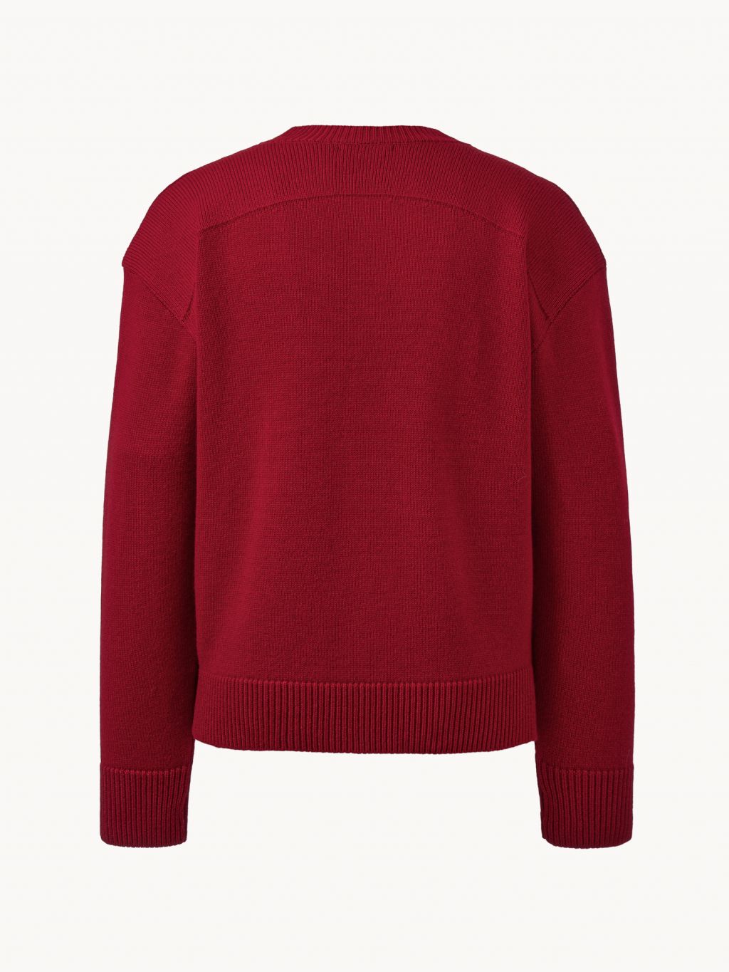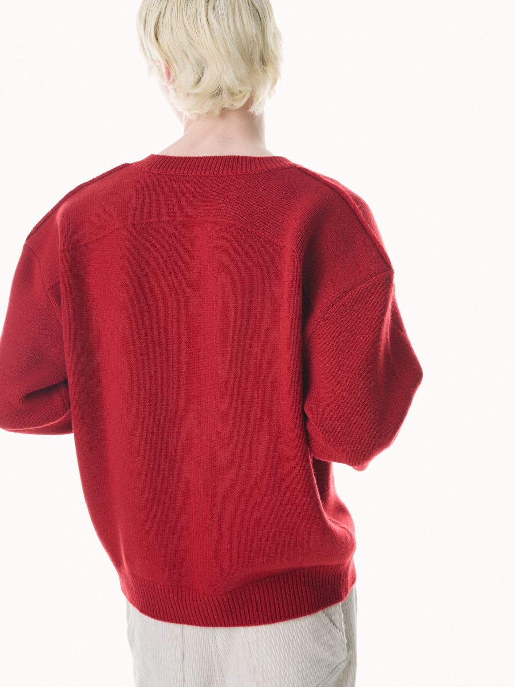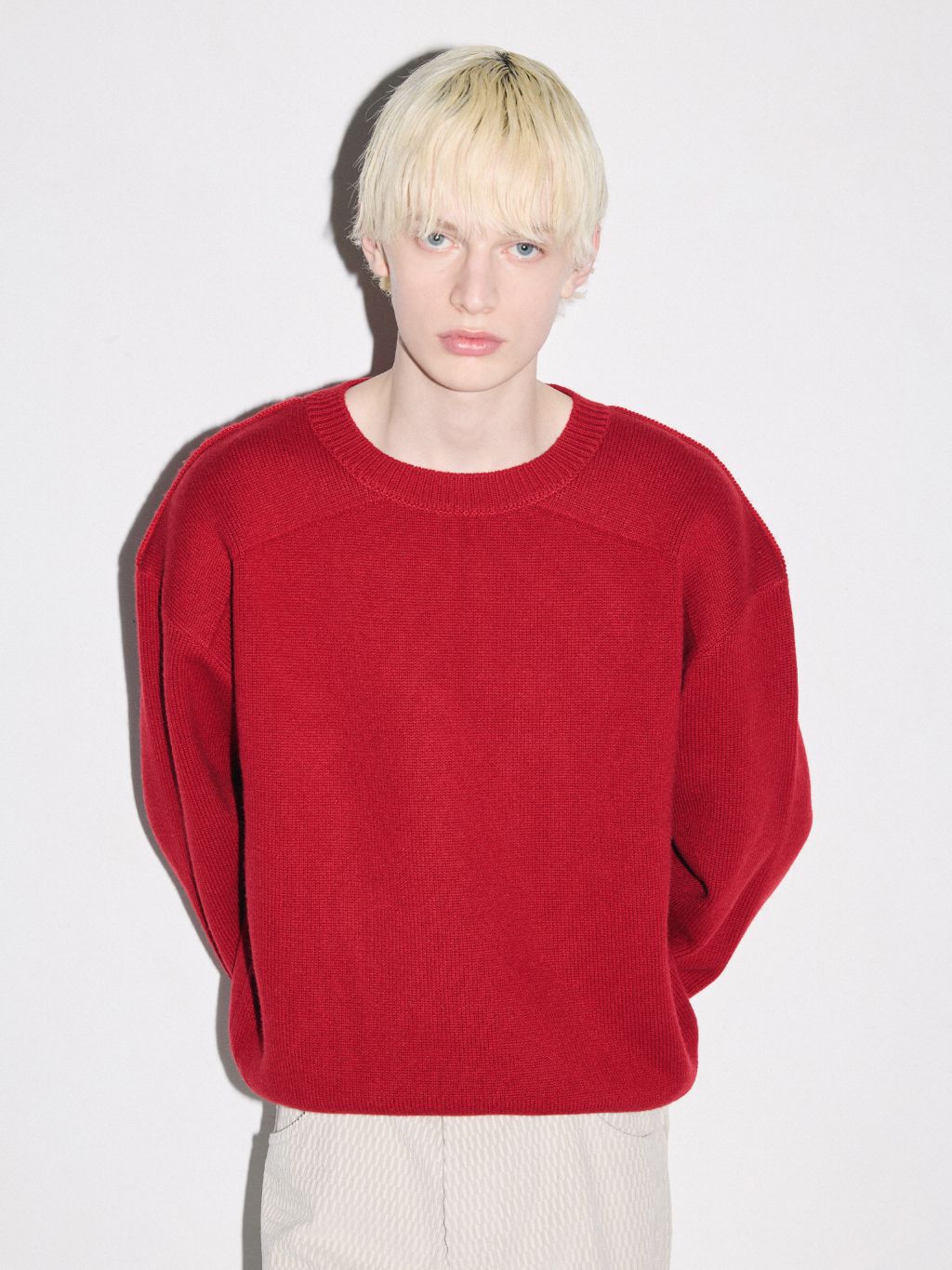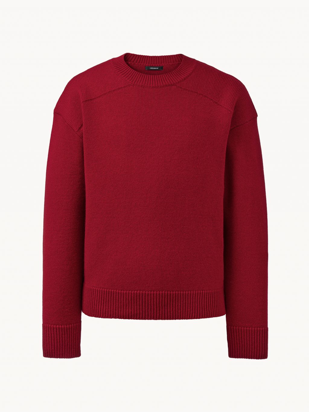 | Classic crewneck sweater in a soft virgin wool and cashmere blend with structured shoulders, relaxed fit, seamless construction, and ribbed neckline, cuffs, and hem. |