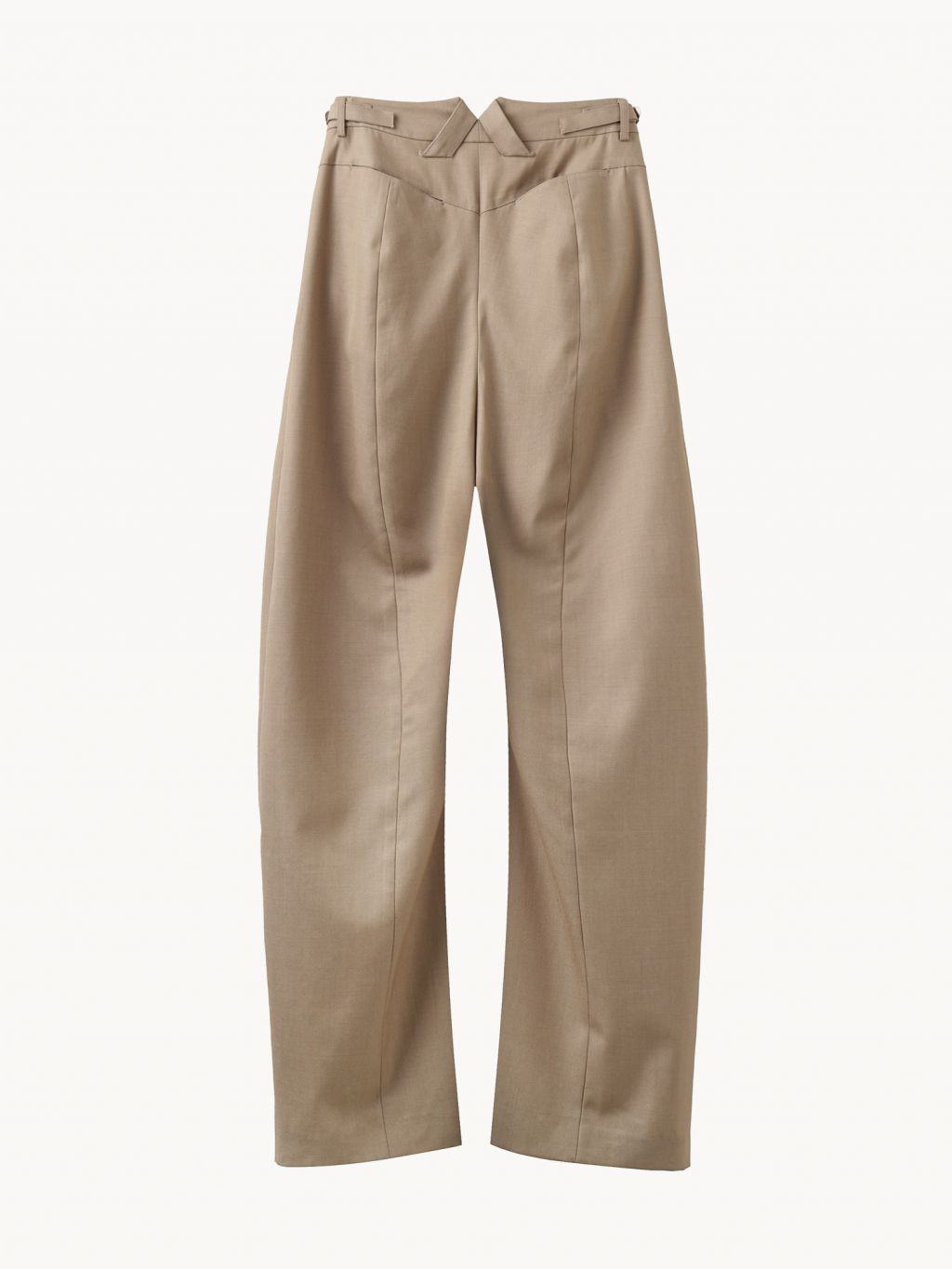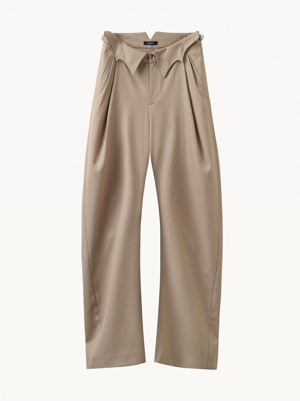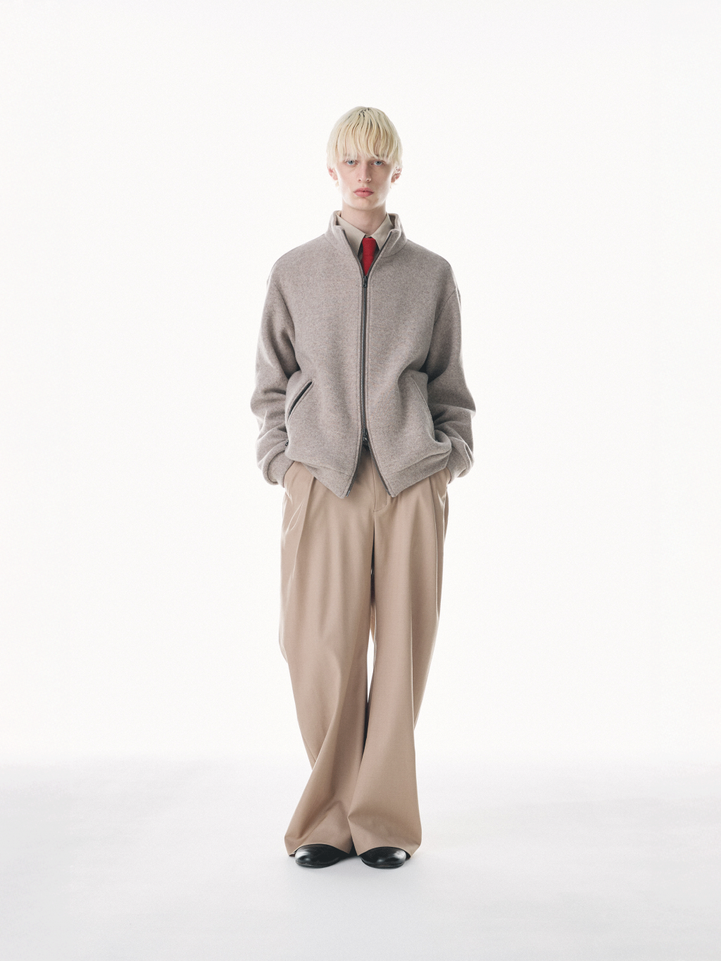 | Tailoring pants that move beyond the conventional two-pleat structure, allowing the drape to fall with natural fluidity. The waist obi is engineered three-dimensionally to maintain its shape while remaining comfortable, featuring the signature batwing detail. Fluid lines and precise construction come together, embodying the brand's approach to tailoring. |