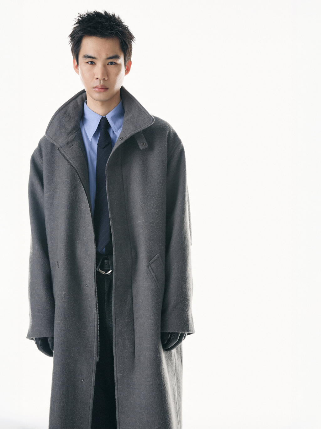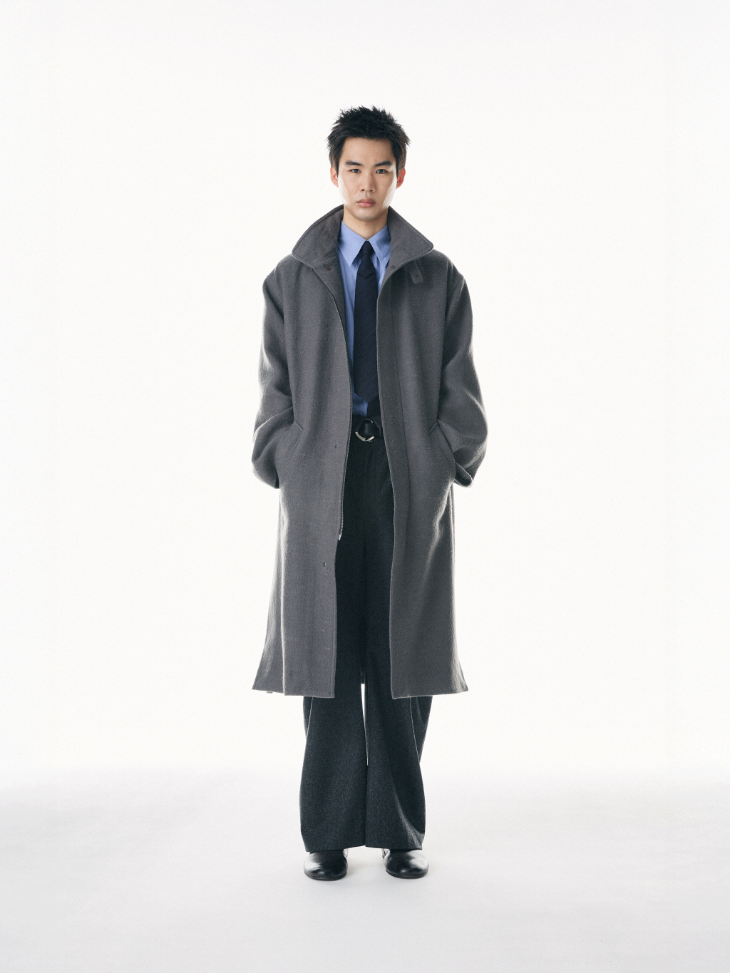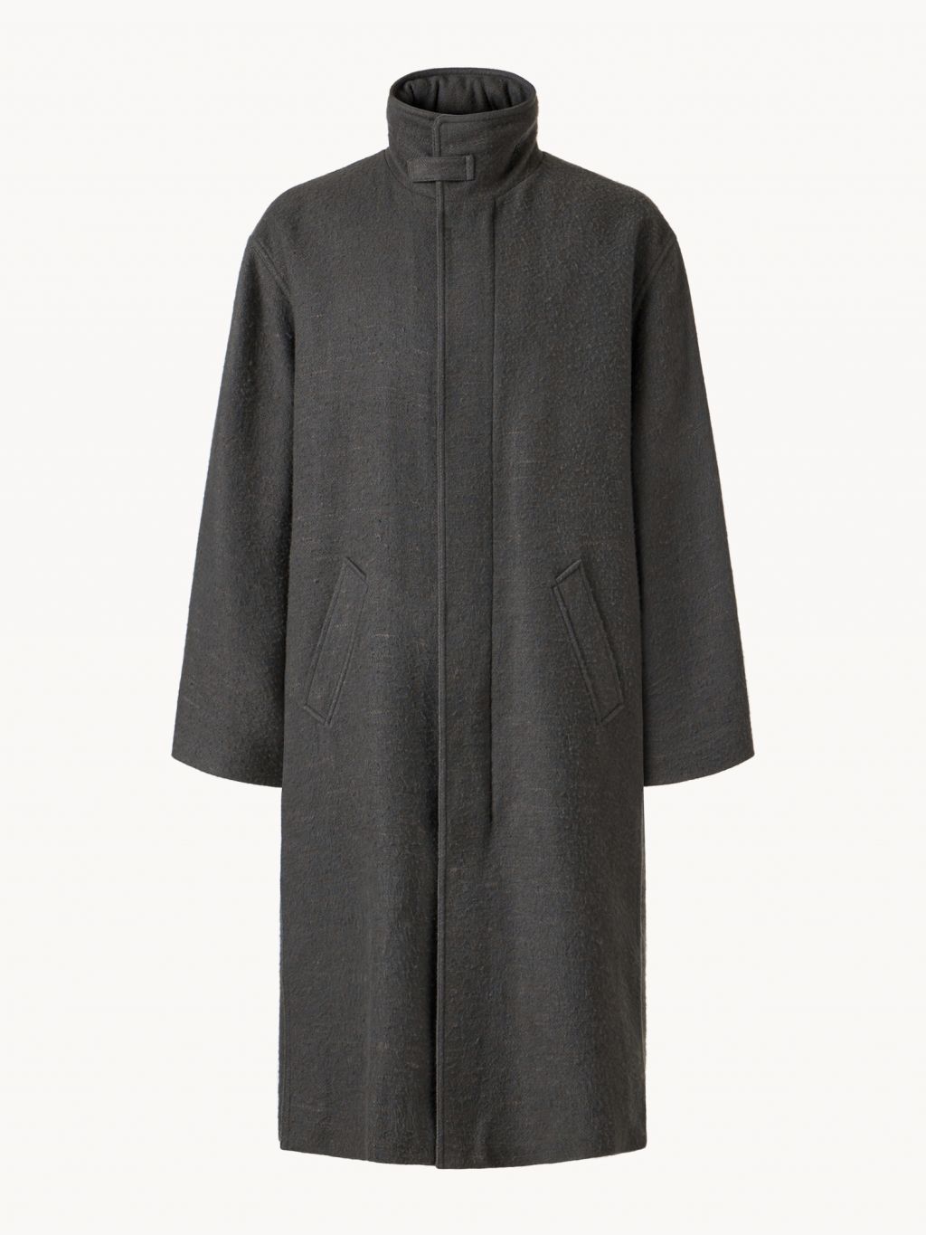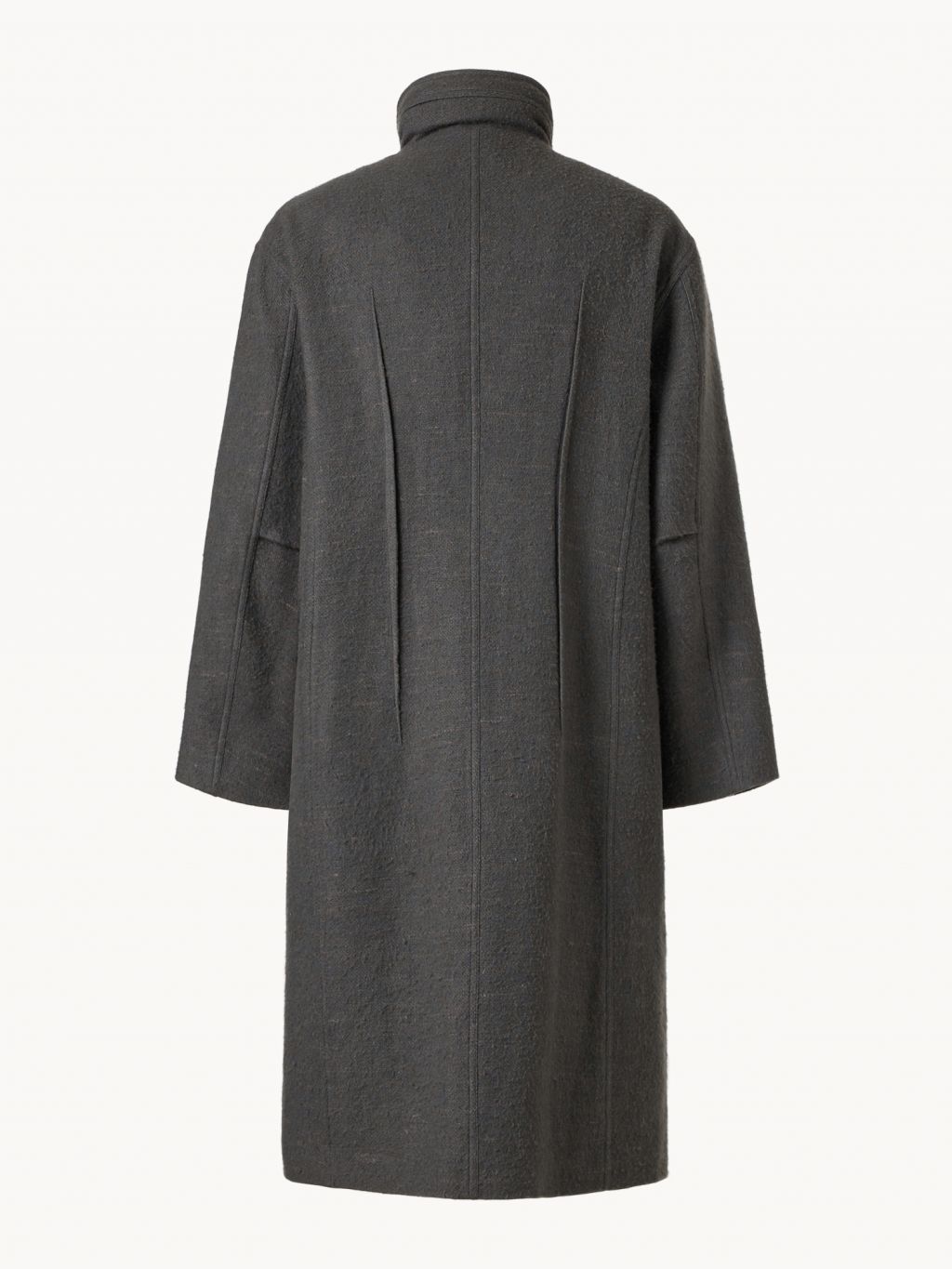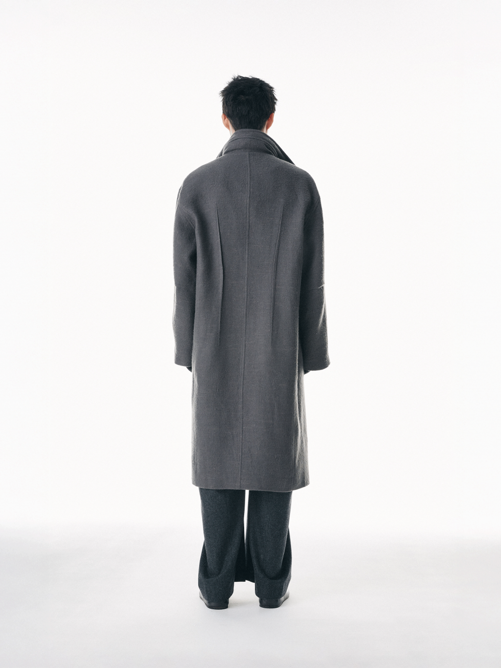 Defined by a clean stand collar, this coat is crafted from an camel wool and linen blend, chosen for its luxurious texture and natural warmth. The fabric lends a refined fluidity that balances elegance with understated strength. Side seam openings provide discreet access to trouser pockets while ensuring effortless movement. Minimal design details - a subtle single tuck at the sleeves and inverted fisheye darts at the back -complete the refined, sculptural silhouette. |