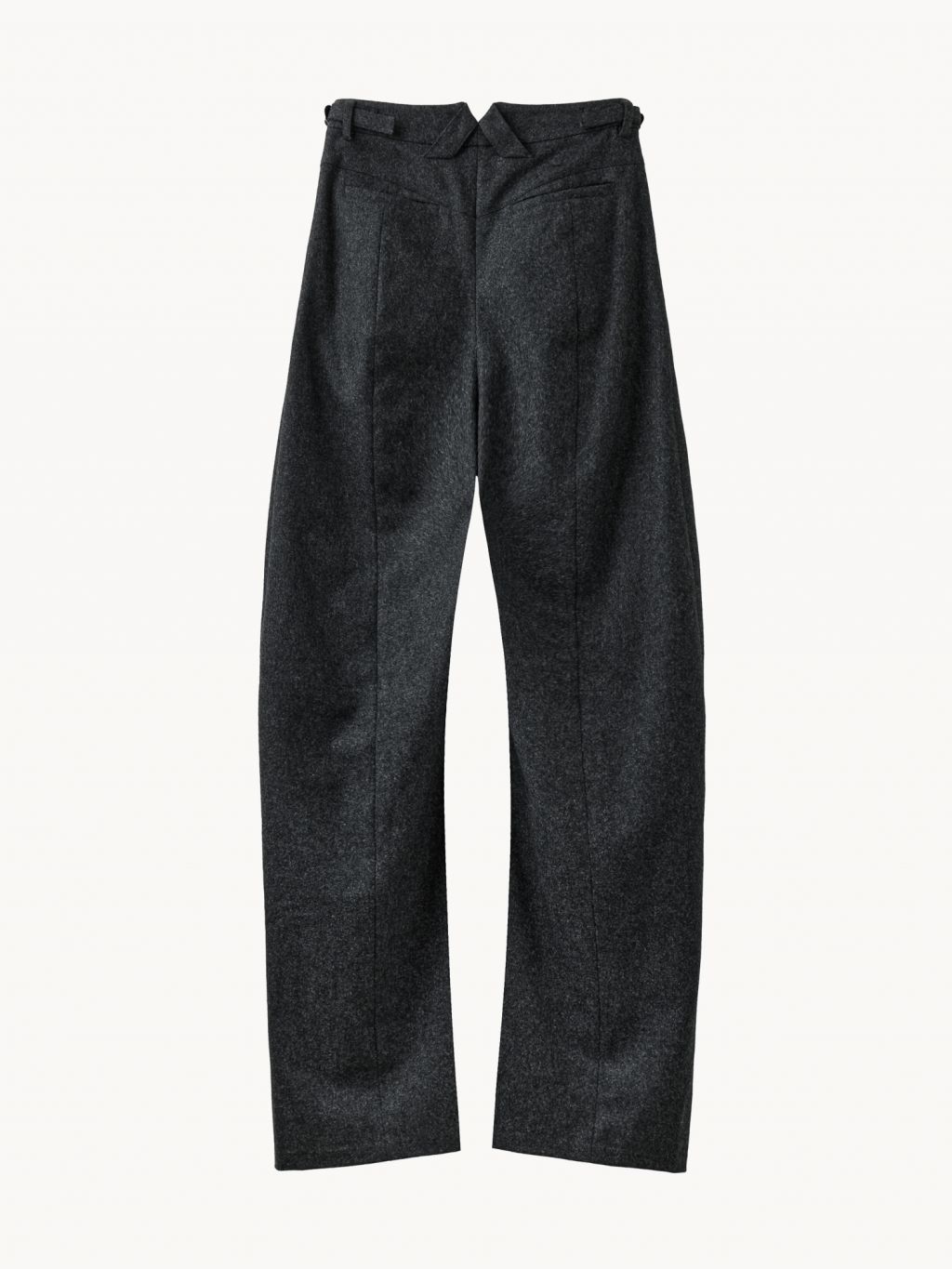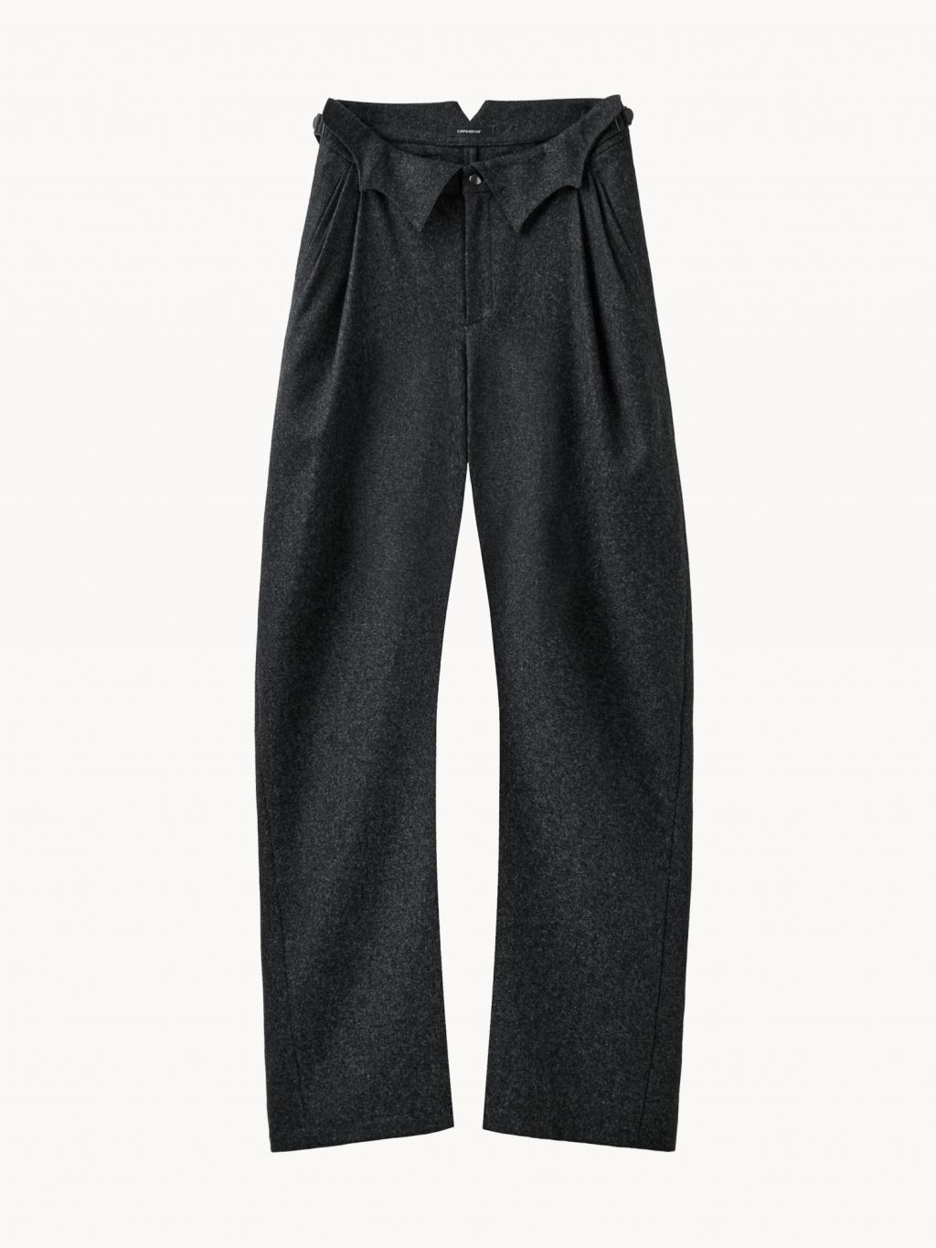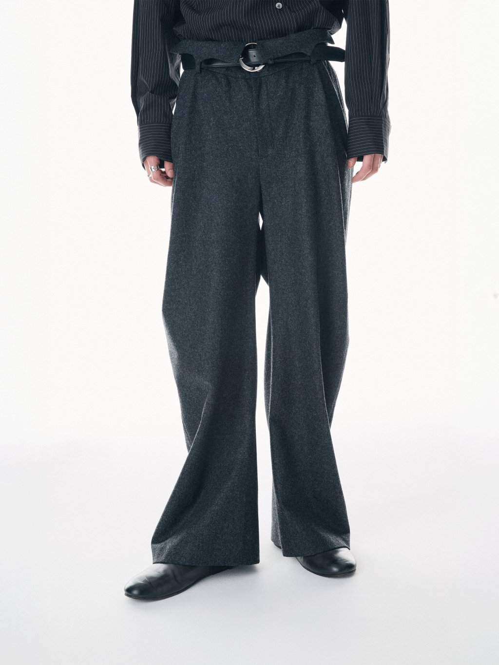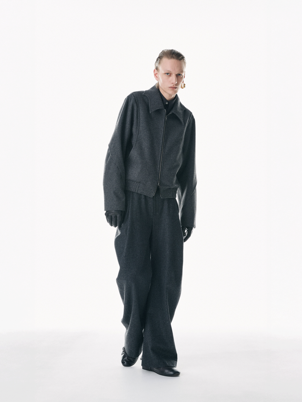 | Tailoring pants that move beyond the conventional two-pleat structure, allowing the drape to fall with natural fluidity. The waist obi is engineered three-dimensionally to maintain its shape while remaining comfortable, featuring the signature batwing detail. Fluid lines and precise construction come together, embodying the brand's approach to tailoring. |